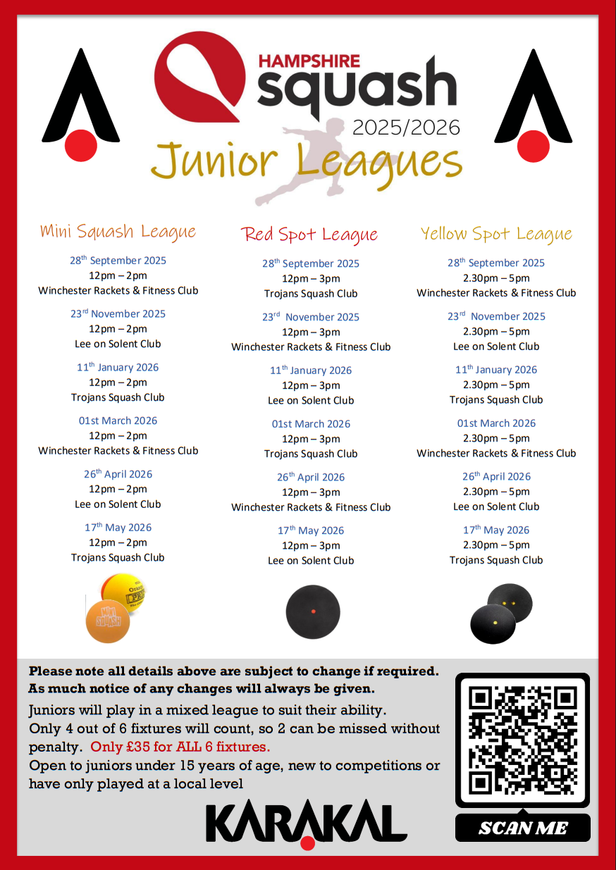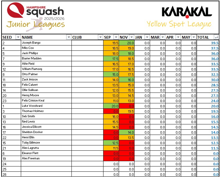 The YELLOW SPOT LEAGUE is for older juniors (~10-14 years) that have normally played 1 or 2 seasons in the junior leagues or have some competitive match play experience. They should be able to play rallies with a single yellow spot ball (which is 10% bouncier than the professional double yellow spot ball). Juniors should have some match play experience at their club with other juniors, have a sound understanding of the rules, as well as be able to mark matches. They should be looking to progress on to playing the Hampshire County Closed (September) and England Squash sanctioned Copper and Bronze events in the near future.