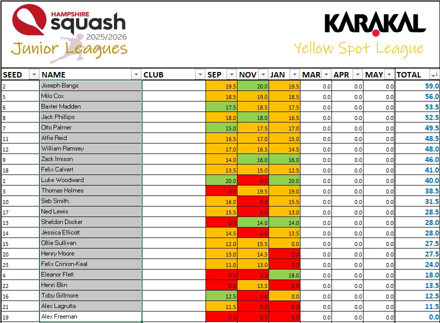 The YELLOW SPOT LEAGUE is for older juniors (~10-14 years) that have normally played 1 or 2 seasons in the junior leagues or have some competitive match play experience. They should be able to play rallies with a single yellow spot ball (which is 10% bouncier than the professional double yellow spot ball). Juniors should have some match play experience at their club with other juniors, have a sound understanding of the rules, as well as be able to mark matches. They should be looking to progress on to playing the Hampshire County Closed (September) and England Squash sanctioned Copper and Bronze events in the near future.